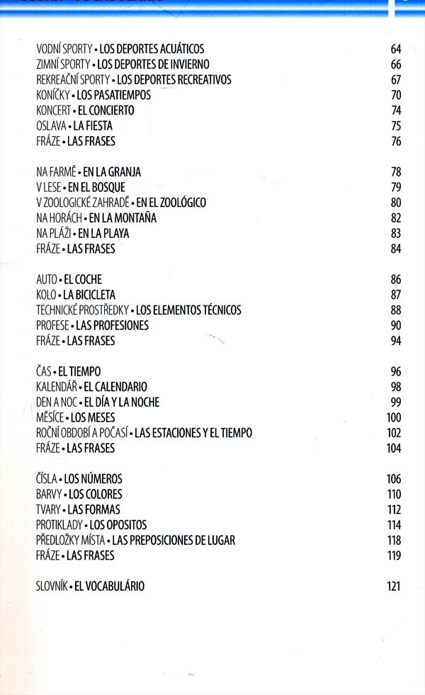 Ilustrovaný slovník znázorňující běžné životní situace, postavy, věci ap. k procvičování španělských slovíček určený začátečníkům, zejména dětem.