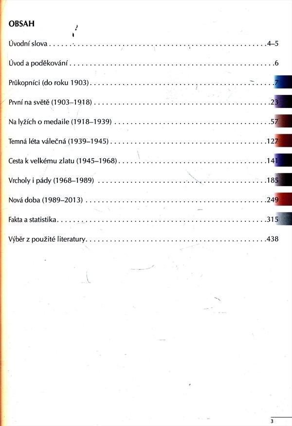 Zaznamenává vývoj lyžování u nás od prvních krůčků až do současnosti, obsahuje také zajímavosti z historie, informace o změnách v materiálním vybavení a lyžařské technice. Knihu oživují přímé vzpomínky pamětníků, profily významných sportovců a činovníků, dobové fotografie. Součástí publikace je též podrobný statistický přehled, v rozsahu dosud nepublikovaném. Nakladatelská anotace. Kráceno.