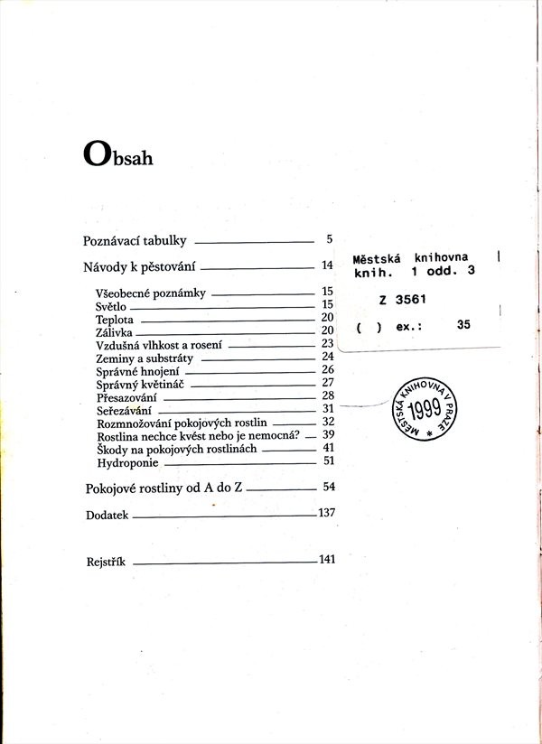Přehled pěstebních podmínek a potřeb pokojových rostlin na světlo, teplo, zálivku, zeminu, hnojení, přesazování, řez a rozmnožování. V úvodu knihy je osm poznávacích tabulek s vyobrazením jednotlivých rostlin, seřazených podle jejich latinských jmen. Tyto rostliny jsou podrobně popsány v druhé části knihy. Každé rostlině je věnována stránka s obrázkem a popisem rostliny. Graficky jsou vyznačny její potřeby na stanoviště, zálivku, hnojení a rozmnožování. Dodatek obsahuje přehlednou tabulku s nároky na ošetření a rejstřík. Much