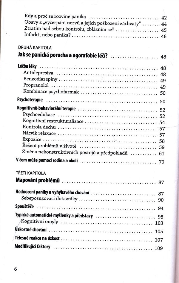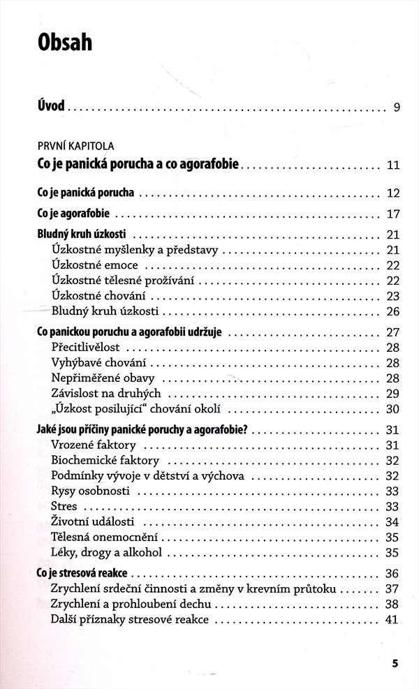 První část obsahuje poznatky, které potřebuje znát člověk trpící panickou poruchou či agorafobií, aby porozuměl tomu, co se s ním děje. Druhá kapitola je věnována detailnímu mapování potíží a nejdůležitějším strategiím léčby. Autoři tyto informace dokládají příběhy z lékařské praxe.