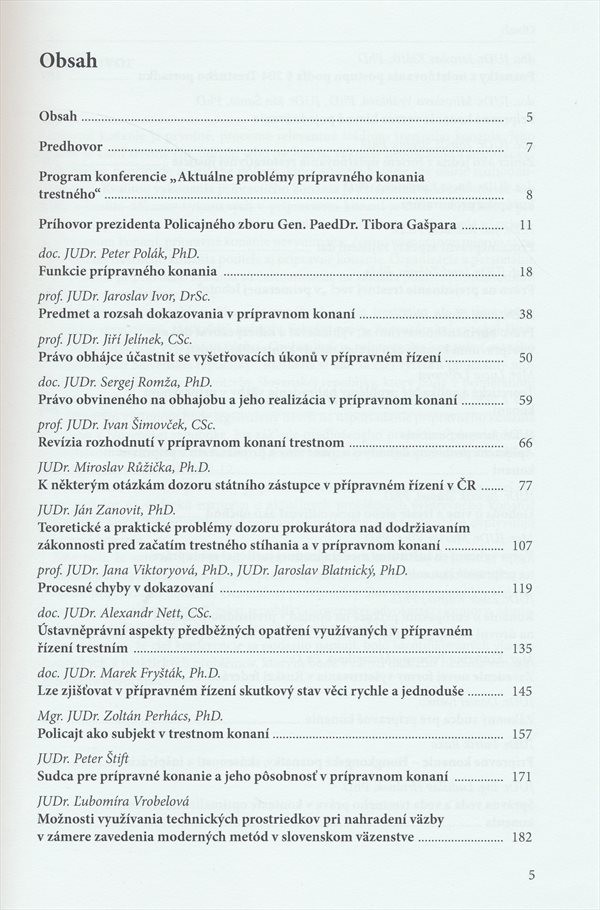 Sborník příspěvků věnovaných problematice přípravného řízení trestního. Většina příspěvků je zaměřena na slovenské právní prostředí.