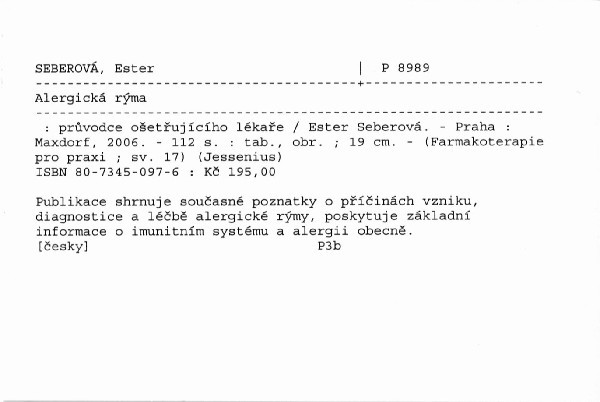 Publikace shrnuje současné poznatky o příčinách vzniku, diagnostice a léčbě alergické rýmy, poskytuje základní informace o imunitním systému a alergii obecně.
