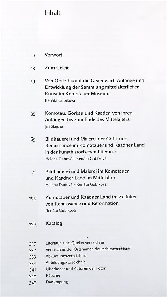 Katalog nové dlouhodobé expozice středověkého a raně renesančního sochařství a malířství v Oblastním muzeu v Chomutově. Zaměřuje se na regionální uměleckou produkci (Chomutovsko, Kadaňsko), kterou zasazuje do širších uměleckohistorických souvislostí.