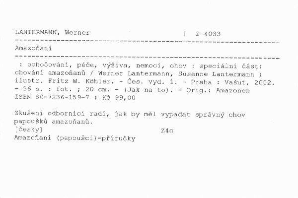 | Podnázev | ochočování, péče, výživa, nemoci, chov : speciální část: chování amazoňanů |