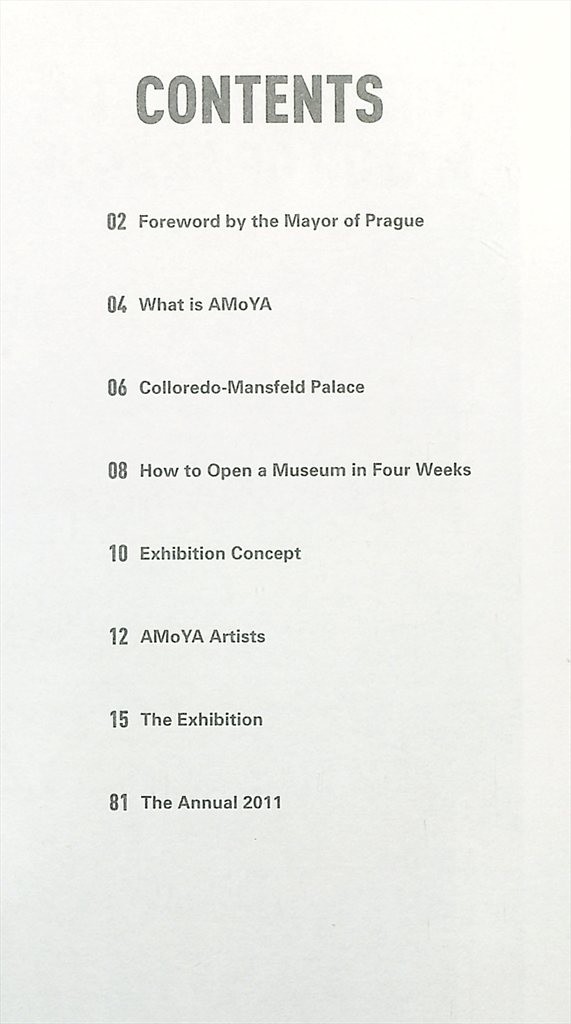 Výpravný výstavní katalog představuje novou pražskou uměleckou instituci: od června 2011 působící Muzeum mladého umění (Artbanka Museum of Young Art). Muzeum vzniklo v jen částečně zrekonstruovaných prostorách barokního Colloredo Mansfeldského paláce v Karlově ulici. V socialistické éře poničený objekt poskytl zajímavou kulisu pro mladé české a slovenské umění. V paláci vystavuje na sto třicet mladých výtvarníků, jež zastupuje dvě stě padesát děl. Celá expozice je roztříděna do tří křídel, přičemž jedno představuje mladou českou a slovenskou výtvarnou scénu, druhé práce studentů sedmi českých a slovenských uměleckých škol a třetí alternativní projekty. Najdeme zde práce známých umělců (D. Černý, J. David atd.), uměleckých skupin (Kamera Skura, Reality) i méně známých výtvarníků. Katalog přináší barevné fotografie vystavených prací. Úvod o vzniku muzea je v angličtině, v české verzi je na konci katalogu. Zde také najdeme seznam všech vystavujících se stručnou charakteristikou jejich práce.
