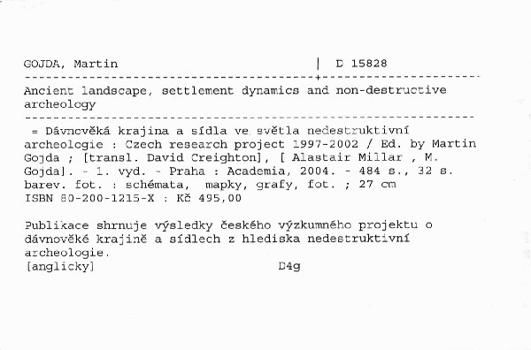 | Podnázev | Czech research project 1997-2002 = Dávnověká krajina a sídla ve světla nedestruktivní archeologie |