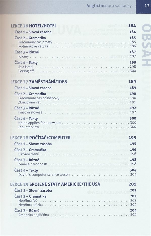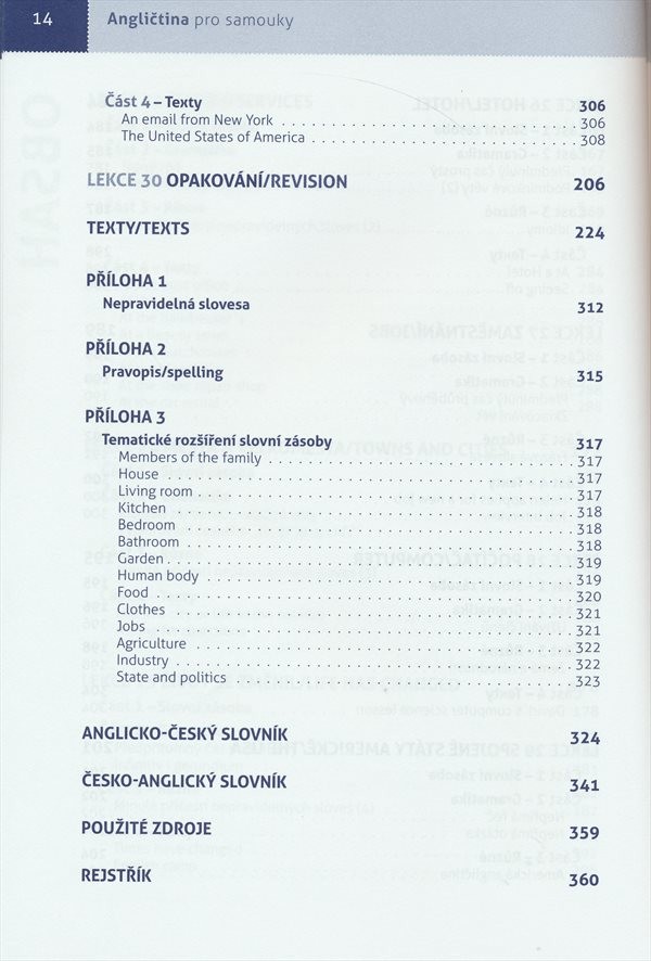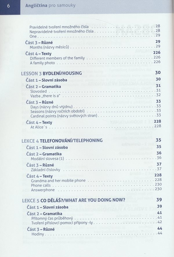 V úvodu obsahuje kapitolu o anglické výslovnosti, následuje 27 základních kapitol a 3 opakovací lekce. Jednotlivé lekce jsou zaměřeny na slovní zásobu, gramatiku, procvičení studované látky; přinášejí také texty a dialogy na určité téma (např. rodina, bydlení, telefonování či zaměstnání). Na konci knihy najde student přílohy (přehled nepravidelných sloves, poučení o pravopisu, tematické rozšíření slovní zásoby) a anglicko-český a česko-anglický slovníček.