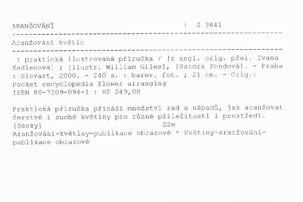 Publikace je rozdělena na dvě části. První je věnovaná tvorbě kytic a aranžmá z čerstvého rostlinného materiálu pro všední i sváteční příležitosti. V druhé části jsou vyobrazeny a popsány suché květy, plody a listy vhodné pro aranžování. Jsou také zmíněny hlavní zásady výběru rostlinného materiálů či nádob. Závěrečná kapitola obsahuje informace o technikách, nářadí a pomůckách k přípravě vazeb z čerstvých i suchých květů. Vše doplněno přehledem rostlin vhodných k aranžování. kopencoz Z2e