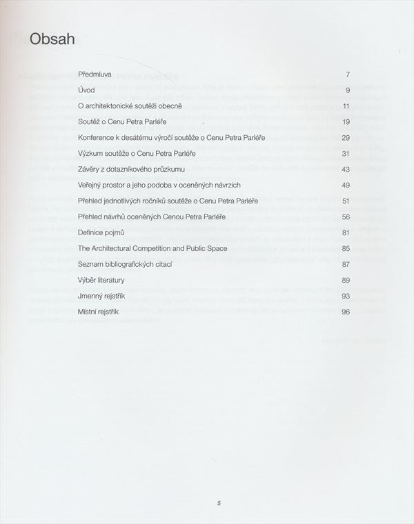 Publikace shrnuje informace o architektonické soutěži o Cenu Petra Parléře. Tématem první části jsou architektonické soutěže obecně, druhá část, jež tvoří jádro publikace, mapuje dosavadní historii soutěže o Cenu PP a zkoumá její výsledky.