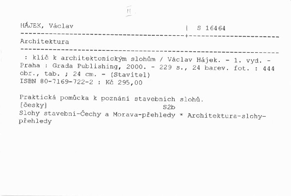 Vývojová řada typických znaků jednotlivých slohů ve zjednodušených popisech, názorných obrázcích a fotografiích. Kniha se soustřeďuje především na ukázky české architektury a charakteristické znaky, které dokumentují ten či onen stavební typ, detail nebo výrazový prostředek slohového období. Do textu jsou vřazeny a vysvětleny odborné výrazy a méně známé pojmy, které jsou na konci knihy zahrnuty do abecedně řazeného slovníku a výklad je rozšířen. Knihu doplňuje jmenný rejstřík s letopočty a rejstřík období, slohů a směrů.