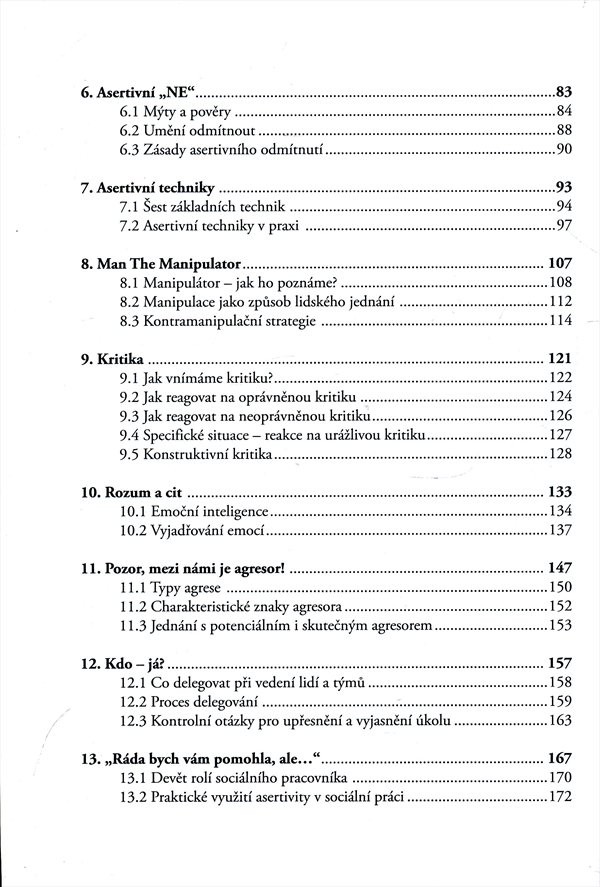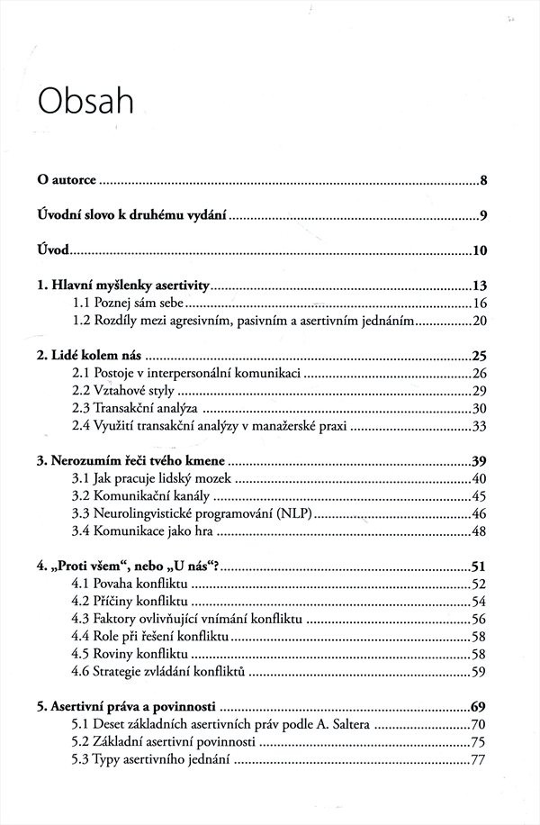 Asertivní jednání vychází z předpokladu, že je možné osvojit si schopnosti, dovednosti a techniky, které umožní překonat působení emocí a díky tomu efektivně vyjádřit své zájmy, potřeby, pocity a postoje; smyslem asertivního jednání je získat zdravé sebevědomí a uchovat si ho. Publikace předkládá výčet způsobů asertivního jednání: strategii zvládání konfliktů, zásady asertivního odmítnutí, kontramanipulační strategie, proces delegování a další.