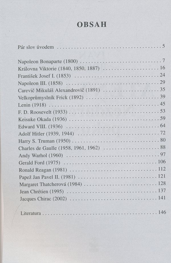 Populárně-naučná publikace poodhalí pozadí pokusů o atentáty na osobnosti jako Napoleon Bonaparte, královna Viktorie, V. I. Lenin, Adolf Hitler, Charles de Gaulle, Andy Warhol, Jan Pavel II., Margaret Thatcherová a mnoho dalších.