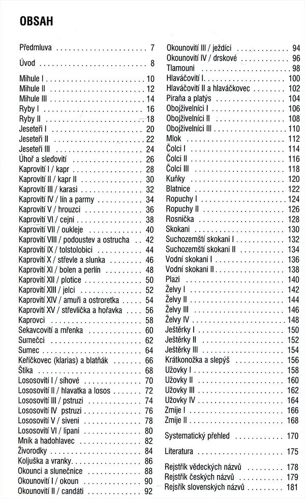 Obrázkový atlas je kapesním průvodcem určeným všem milovníkům přírody a slouží jako pomůcka k určování volně žijících mihulí, ryb, obojživelníků a plazů. V knize jsou zařazeny druhy, které jsou na území České a Slovenské republiky původní, druhy introdukované i ty, které z naší přírody již vymizely. Obrazovou část atlasu doplňuje text, který popisuje jednotlivé druhy a informuje o jejich výskytu, způsobu života a významu. Textová část zahrnuje také moderní poznatky o systematickém postavení těchto obratlovců. Informace o výskytu druhů doplňují názorné mapky.