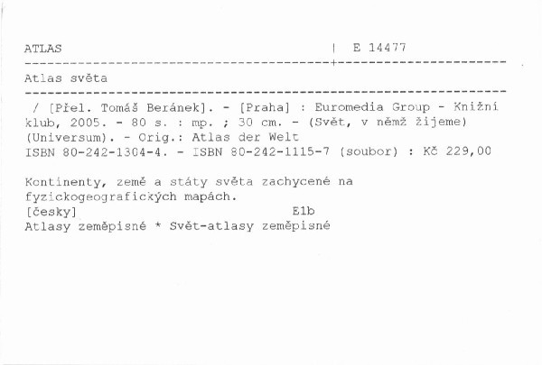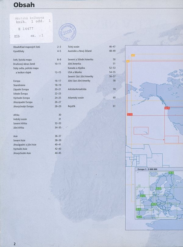 Přehledná kartografická příručka obsahuje fyzickou mapu světa, družicový obraz Země a mapy jednotlivých kontinentů, regionů a států světa.