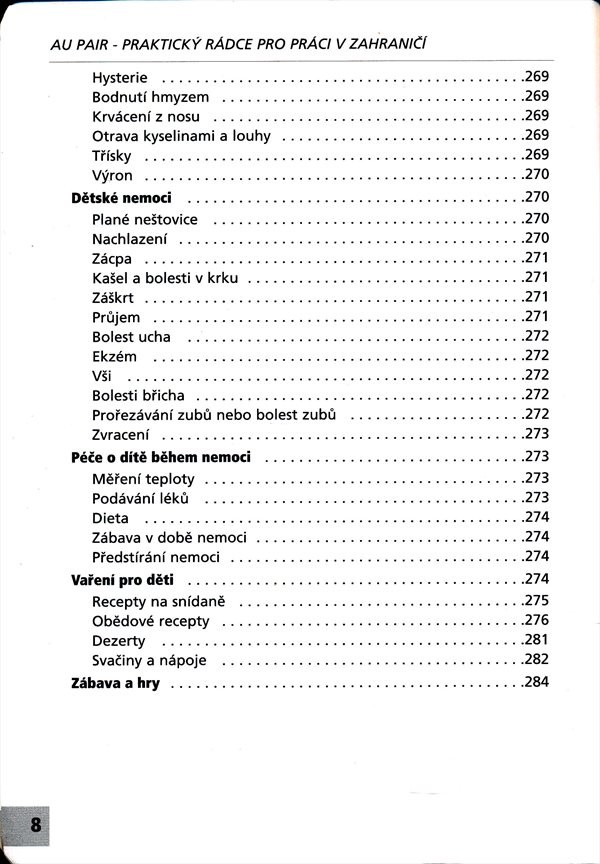 Vysvětluje, co znamená být au pair, jaký je rozdíl mezi chůvou a pomocnicí matky. Jaké jsou jejich povinnosti a co od nich zahraniční rodiny očekávají. Upozorňuje na možné problémy v rodině (změna životního stylu, stesk, problémy s dětmi apod.) a jak je řešit. Podstatná část publikace provází jednotlivými zeměmi, u každé jsou uvedena vízová pravidla, zdravotnické a sociální pojištění, výhody a nevýhody práce, využití volného času, seznam domácích agentur spolupracujících s konkrétní zemí. V závěru je uveden adresář agentur a několik praktických návodů pro práci (první pomoc, péče o dítě během nemoci, kuchařské předpisy, zábavné hry).