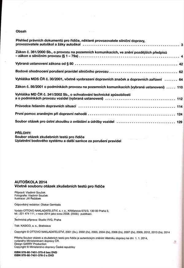 Učebnice pravidel silničního provozu obsahuje zákon o provozu vozidel na pozemních komunikacích, popis dopravních značek, řešení dopravních situací na křižovatkách, zásady poskytování první pomoci zraněným ad.
