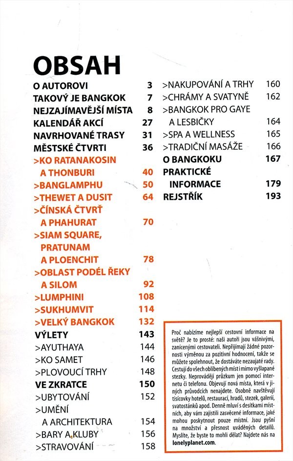 Cestovní příručka nabízí informace o nejzajímavějších místech Bangkoku, kalendář kulturních akcí, přehled doporučených tras městem, kapitoly věnované jednotlivým městským čtvrtím s plánky, shrnutí údajů užitečných pro návštěvníky (ubytování, památky, stravování, nakupování atd.).
