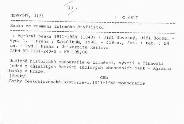 Ucelená historická monografie o založení, vývoji a činnosti jedné z důležitých českých akciových obchodních bank - Agrární banky v Praze.