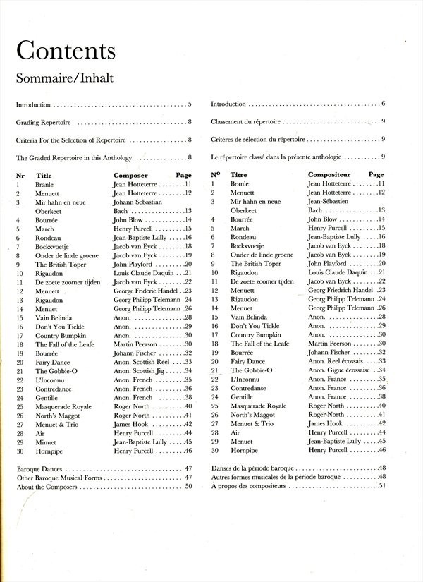 Autor hudbyHotteterre, Jean; Bach, Johann Sebastian; Blow, John; Purcell, Henry; Lully, Jean-Baptiste; Eyck, Jacob van; Playford, John; Daquin, Louis-Claude; Händel, Georg Friedrich; Peerson, Martin; Telemann, Georg Philipp; Fischer, Johann; North, Roger; Hook, James