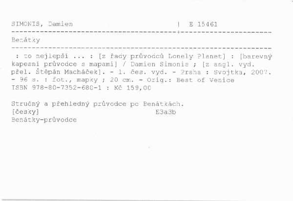 Okouzlující,tajemné a jedinečné město. V jednotlivých kapitolách najdeme nejznámější místa, kterých je v Benátkách opravdu mnoho a která by žádný návštěvník neměl opomenout (Bazilika sv. Marka, Dóžecí palác, náměstí sv. Marka, Velký kanál, muzea, galerie, paláce, kostely). Průvodce nabízí náměty na výlety lodí po okolních ostrovech, krátké kurzy (výroba masek, tisk, nebo přípravy kuchařských specialit). Dále se seznámíme s nekonečnými možnostmi nakupování od tradičních řemeslnických a uměleckých výrobků po špičkovou módu. Kapitoly stravování, ubytování a zábava nám pomohou se zorientovat v bohaté nabídce benátských restaurací, hotelů a kaváren různých cenových kategorií. Nechybí ani kapitola stručné historie města a fakta pro návštěvníky v tísni. Průvodce je doplněn barevnými fotografiemi a na obalu je opatřen mapkou města.