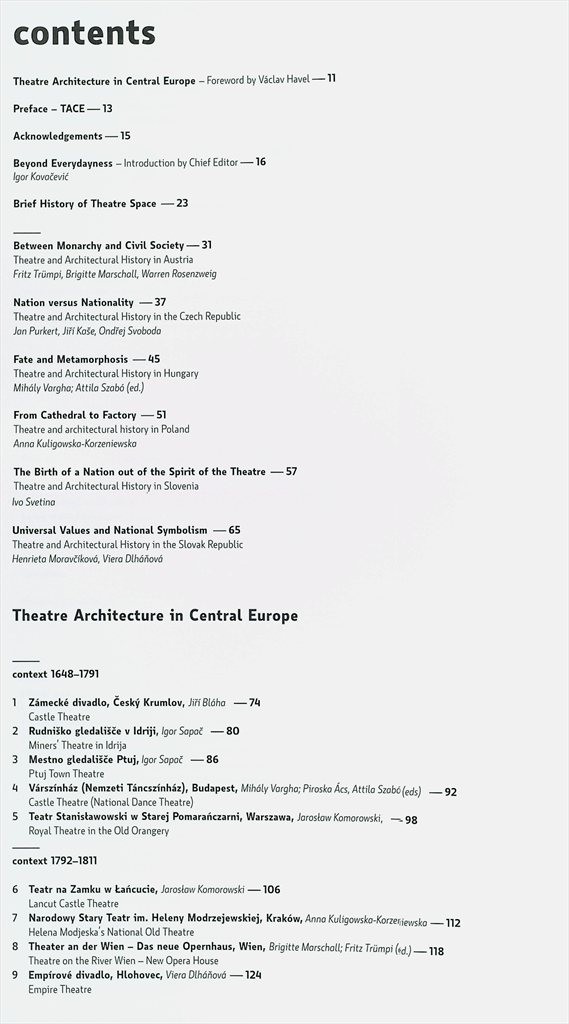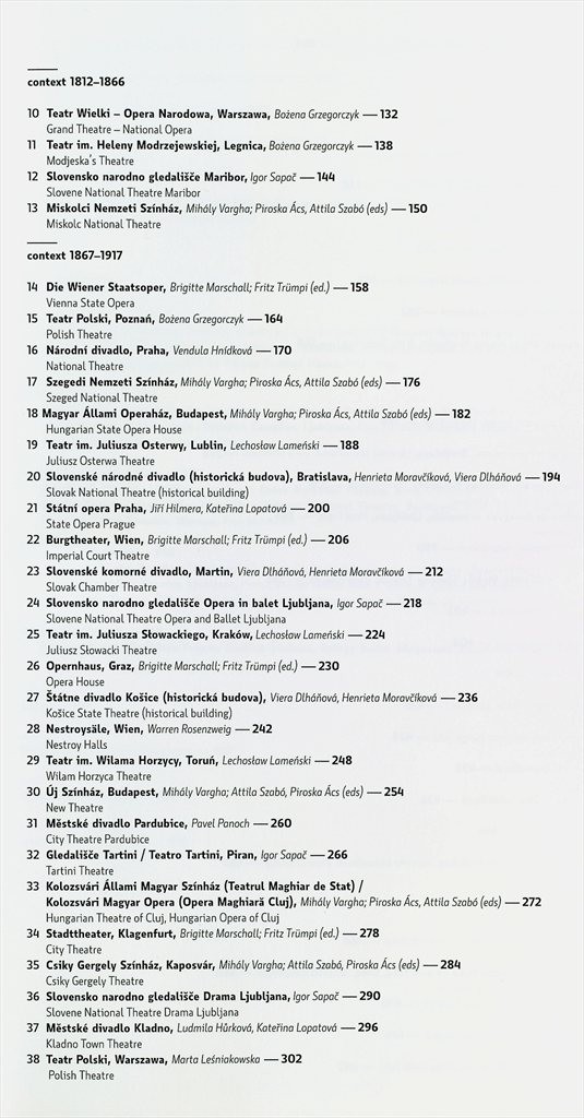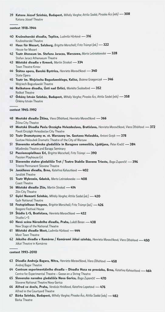 Výpravná publikace chonologicky představuje více než sedm desítek po architektonické a historické stránce nejvýznamnějších a nejslavnějších divadelních budov v zemích střední Evropy.