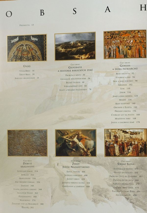Velkorysý rozsáhlý biblický atlas mnohačlenného týmu autorů obsahuje srozumitelný text, informativní mapky, zajímavosti, tabulky, slovníček, bibliografii a především řadu reprodukcí uměleckých děl ztvárňujících různé biblické události.