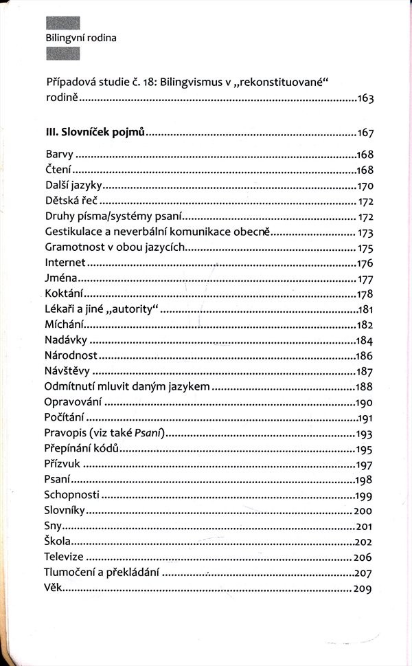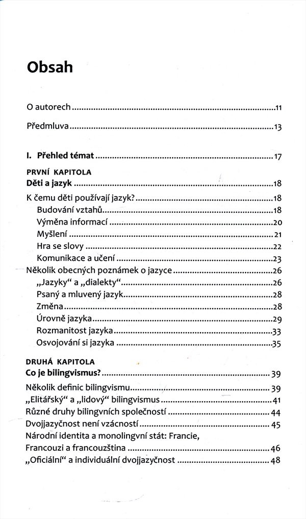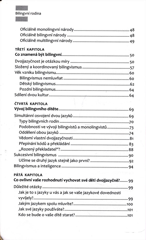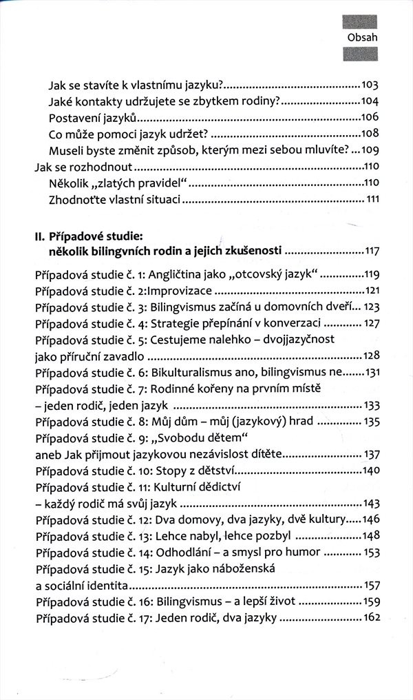 Pomůže jim uchopit všechny faktory, které bilingvní výchovu ovlivňují, a nabídne jim rozličná řešení problémů, s nimiž se bilingvní rodina potýká. Informace doplňuje množství případových studií. Závěrečná část knihy obsahuje abecedně řazený rejstřík hesel. Autoři vycházejí z vlastní zkušenosti rodičů vychovávajících své děti v bilingvním prostředí a zprostředkovávají i zkušenosti jiných bilingvních rodin, se kterými při psaní knihy spolupracovali. Kniha je určena nejen rodinám dětí, kteří vychovávají své děti v dvojjazyčném prostředí, ale i dalším zájemcům o multikulturní prostředí. Nakladatelská anotace