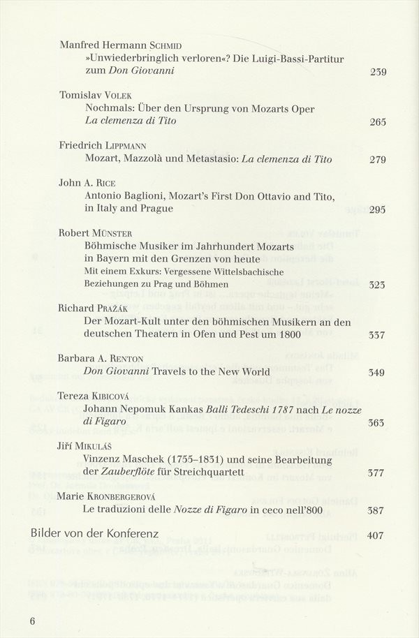 Sborník příspěvků z mezinárodní pražské konference k výročí W. A. Mozarta v r. 2006 je věnován především zhodnocení českých resp. pražských aspektů, které sehrály význačnou roli v Mozartově životě a díle a v dobové recepci jeho tvorby.