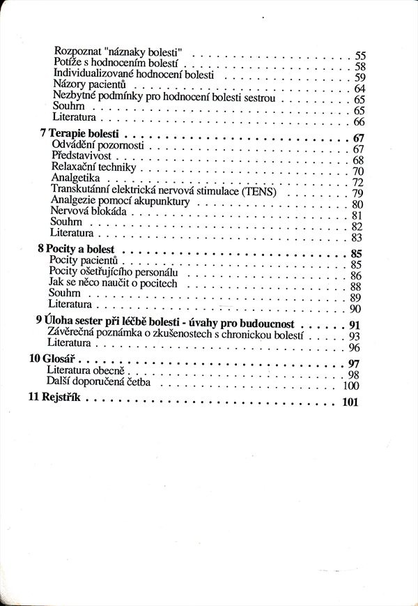 Základní poznatky z oblasti neurofyziologie a psychologie bolesti. Autorka klade důraz na dobrou spolupráci sestry s lékařem a aktivní reakci zdravotnického personálu, zvláště zdravotních sester, na stížnosti a stav pacienta. Důležité informace jsou obsaž