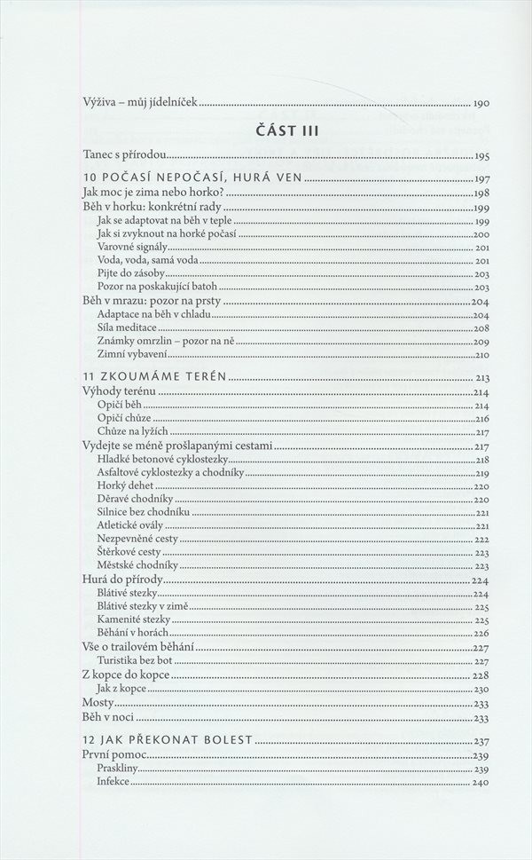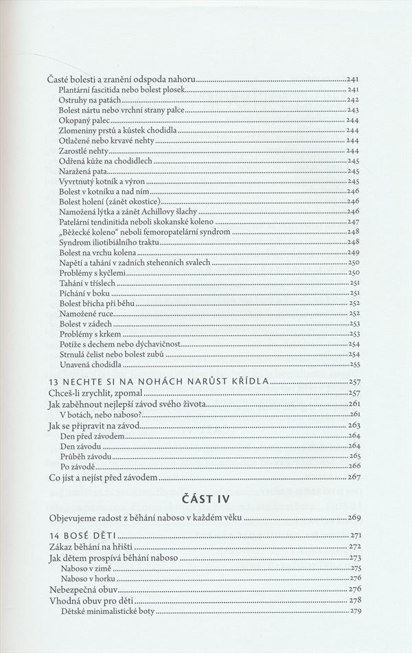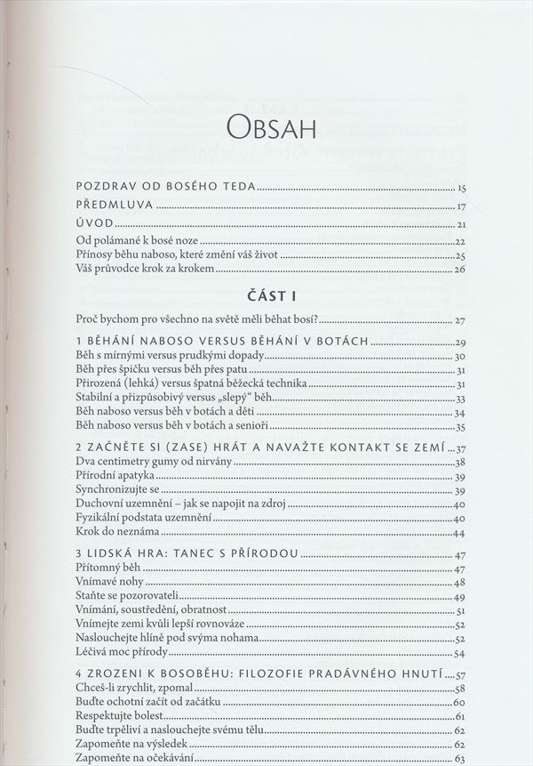Autor popisuje základní prvek bosého běhání, jímž je technika, a přes detailní rozbor cviků na posílení chodidel postupuje k nácviku běžeckých dovedností, jejichž cílem je připravit vás na svobodný pohyb po všech myslitelných površích.