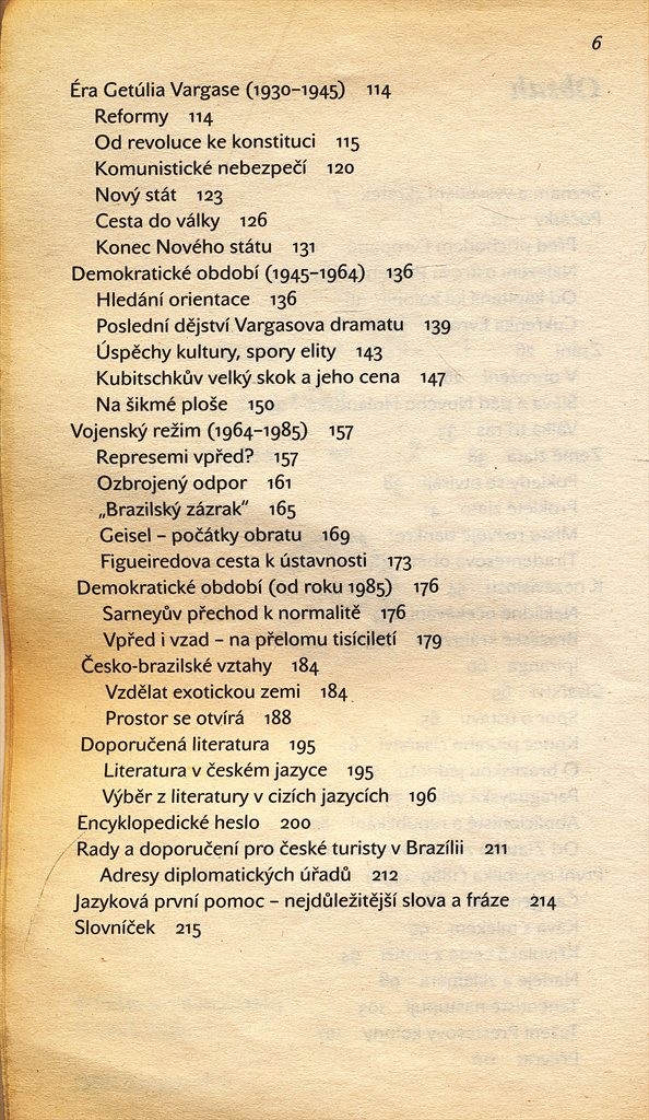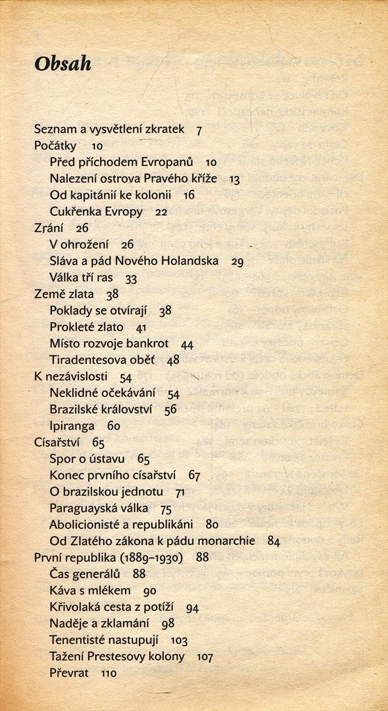 Historický vývoj země od prastarých brazilských indiánských kultur. Portugalská expanzi, kolonizační aktivity Evropanů a vznik nezávislého státu. Ekonomické a společenské změny v průběhu 20. století. Závěr je věnován postupné demokratizaci státu se smíšenou specifickou slovesnou i výtvarnou kulturou a jeho vývoji v moderní době. Závěrečná kapitola pojednává o česko-brazilských vztazích. Monografii doplňuje seznam literatury, encyklopedické heslo, rady pro turisty, adresy a slovníček.