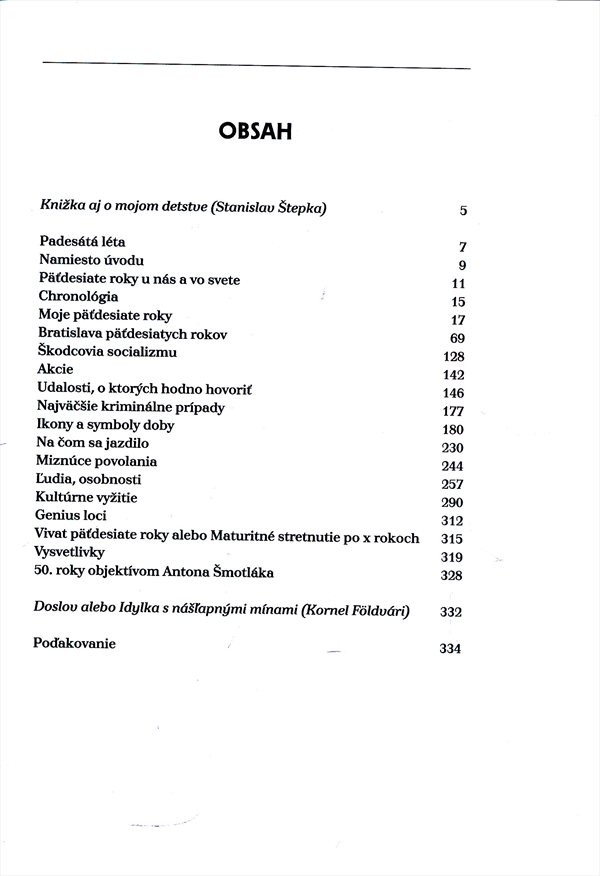 Autobiografické vzpomínky autora na dětství prožité v 50. letech 20. století v Bratislavě. Vyprávění zachycuje každodenní život a zajímavé reálie budovatelského období s jeho symboly, ikonami, významnými událostmi a osobnostmi.