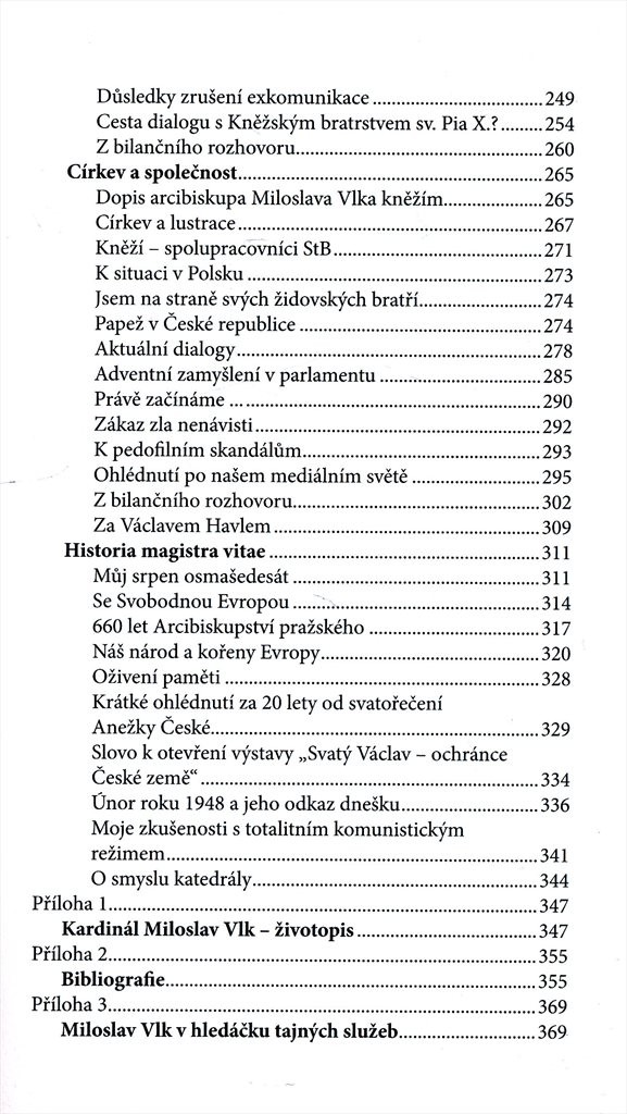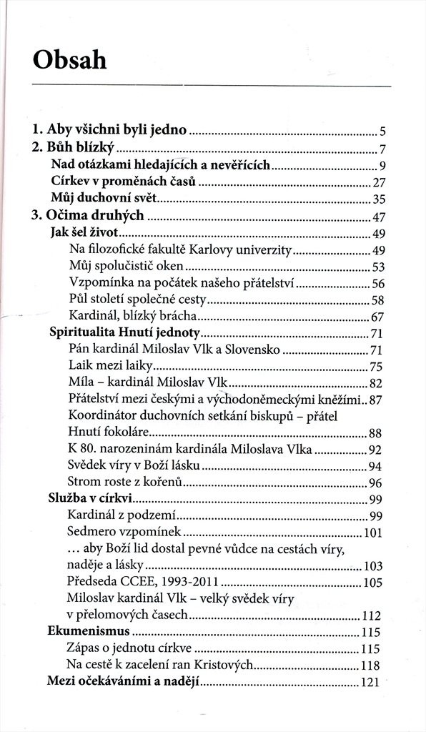 Společenské problémy dneška, postavení a role církve v současném světě, vztahy k nevěřících, ale i vlastní duchovní život a zkušenost víry - to jsou jen některá z témat, k nimž se Miloslav Vlk v rozhovoru vyslovuje. Knížka seznamuje s osobností jubilanta i prostřednictvím vzpomínek jeho přátel, bývalých kolegů či představitelů církví. Další část publikace tvoří reprezentativní výběr téměř šesti desítek Vlkových příspěvků různých žánrů (osobní postřehy, komentáře, promluvy, přednášky, pasáže z bilančního rozhovoru, kterým Vlk uzavíral své působení v roli pražského arcibiskupa v roce 2010). V přílohách najde čtenář kardinálův životopis, jeho bibliografii a ukázky z materiálů, které na Miloslava Vlka vedla v minulosti Státní tajná bezpečnost.