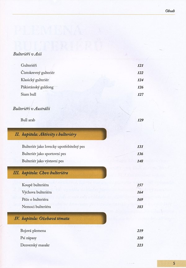 Publikace se zabývá péčí a chovem psů všech plemen teriérů typu Bull. Možné aktivity s bulteriéry, seznam nemocí atd. Ožehavá témata (ilegální psí zápasy), omyly a mýty, týkající se těchto bojových plemen.
