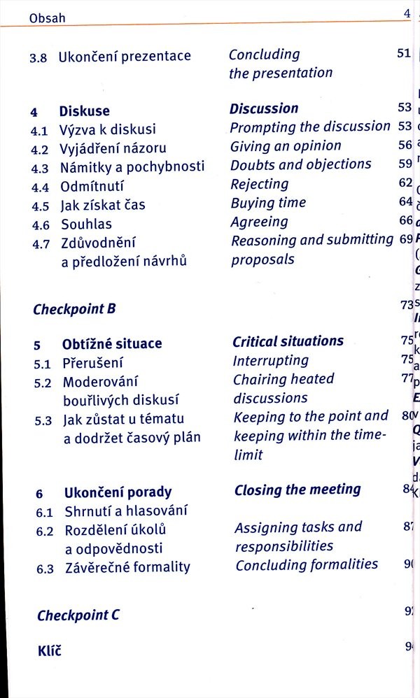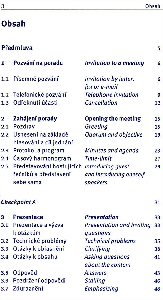 Titul, určený pro čtenáře s mírně pokročilou úrovní angličtiny, se soustřeďuje na potřebné tématické okruhy (př. zahájení porady, prezentace, diskuze...), ke kterým poskytuje nejen slovní zásobu, ale i krátké testy pro ověření znalostí.