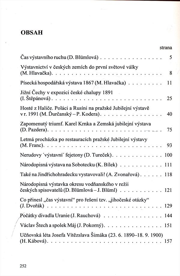 Kolektivní práce z cyklu sledujícího kulturní dějiny přelomu 19. a 20. století, tentokrát prizmatem společenského ruchu kolem reprezentativních výstav z devadesátých let 19. století, Jubilejní a Národopisné (faksimile prostorových plánků obou tvoří unikátní přílohu knihy). Vedle obecných informací (Výstavnictví v českých zemích od M. Hlavačky) jsou přítomny i studie sledující regionální reflexi vlny výstavnictví (Písek, Jindřichův Hradec, Sobotka) nebo specifické okruhy každodennosti s výstavnictvím související (kulinářská podoba Jubilejní výstavy, tvůrce zbraní K. Krnka a jeho úspěchy na výstavách, fejetony J. Nerudy k tématu a mnohé další). Nakladatelská anotace.