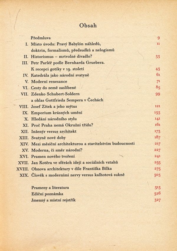 Devatenáct studií se dotýká témat a aspektů architektury historismu a rané moderny v konfrontaci s projevy dobového myšlení a výtvarného cítění české společnosti.