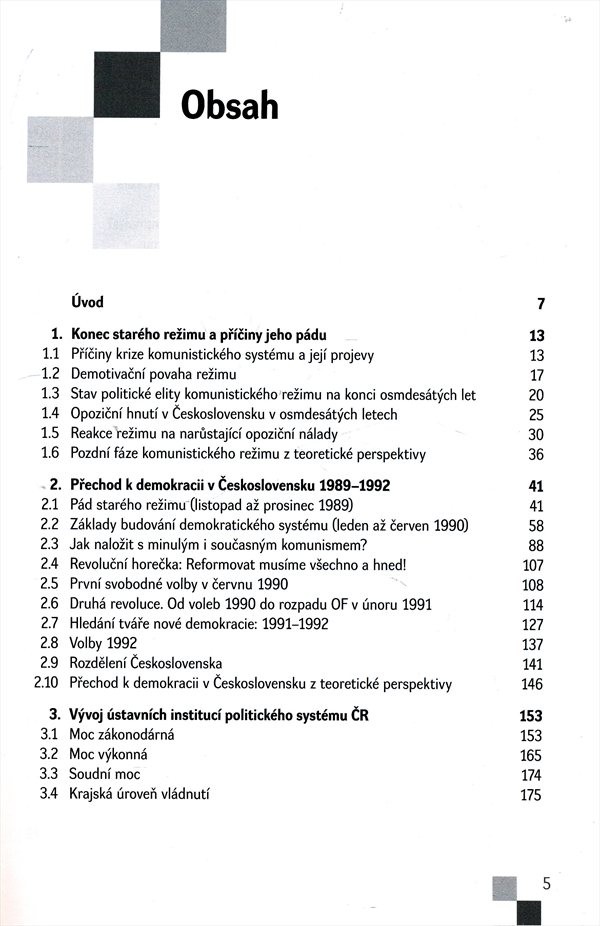 První kapitola sleduje zhroucení komunistického režimu v Československu a jeho příčiny, druhá kapitola popisuje politický vývoj v zemi během let 1989-1992, který byl charakterizován přechodem od totality k demokracii, třetí se zaměřuje na vývoj a postavení ústavních institucí ČR v letech 1993-2010, další mapuje volební systémy užívané v našem prostředí, pátá charakterizuje vývoj stranického systému a politických stran v ČSFR a ČR, šestá hodnotí vznik a fungování českých vlád do roku 2010 a závěrečná se pokouší o rozbor politické kultury v ČR.