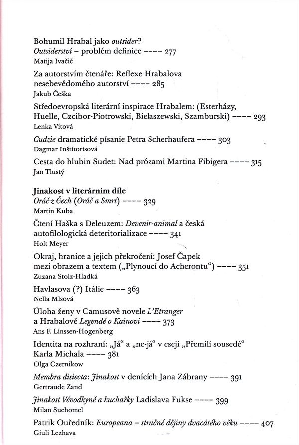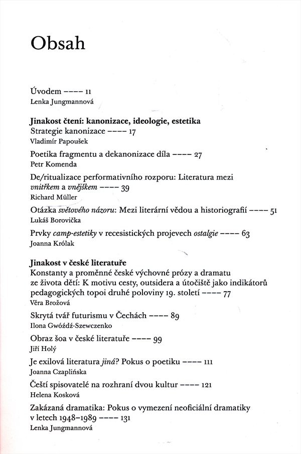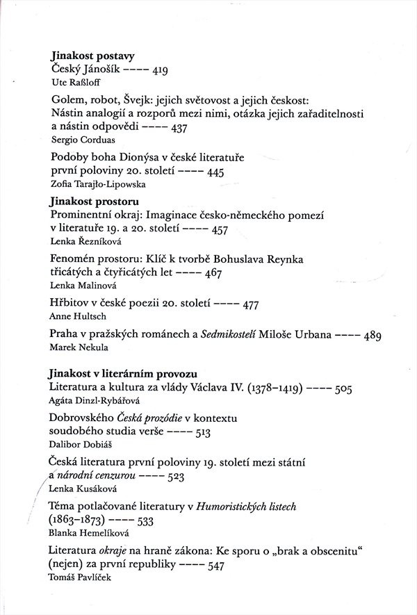 Sborník studií ze IV. kongresu světové literárněvědné bohemistiky (28.5.-3.7. 2010 v Praze). Přítomný soubor se zabývá tematikou jinakosti v české i světové literatuře, včetně staršího literárního kontextu.