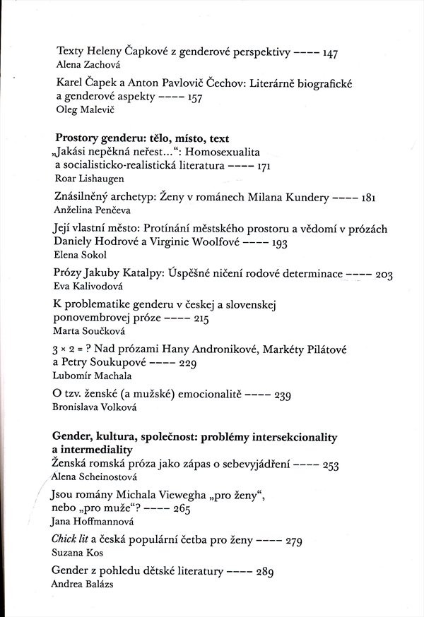 Soubor studií se zamýšlí prostřednictvím genderové analýzy a kritické interpretace nad literárním textem, prezentuje široké spektrum teoretických a tematických přístupů, od kritického čtení klasiky až po genderové hodnocení současné české literatury. Úvodní studie mapují český literárněvědný kontext z pozice genderového myšlení, další se zabývají odrazem genderu v tvorbě a životě bratří Čapků, Heleny Čapkové, Milana Kundery. Problematiku městského prostoru a vědomí z pohledu genderových studií odráží díla Daniely Hodrové a Virginie Woolfové, prózy Jakuba Katalpy a dalších významných autorek (Hany Andronikové, Markéty Pilátové, Petry Soukupové), včetně románů Michala Viewegha, ženské romské prózy a mnohých jiných fenoménů. - Bibliografie, jmenný rejstřík. Výstupem z kongresu jsou ještě další tři sborníky: Česká literatura rozhraní a okraje, Česká literatura v intermediální perspektivě a Máchovské rezonance (v souvislosti s výročím).