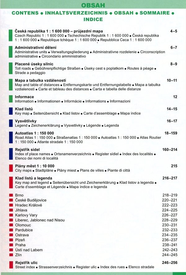 Atlas obsahuje automapu České republiky, rejstřík sídel, průjezdní plány krajských měst s rejstříkem ulic, placené úseky silnic, turistické zajímavosti.