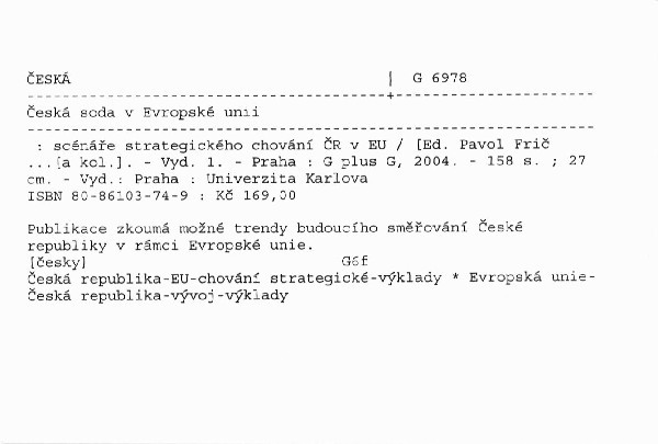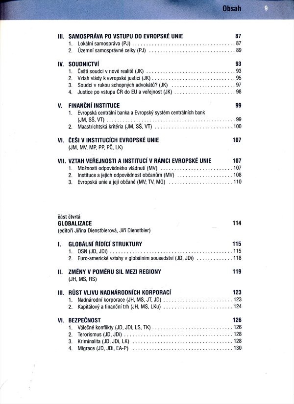 Analýza institucionálního, politického a sociálního vývoje České republiky v jednotném evropském prostoru. Autorský kolektiv zohledňuje vliv globalizace na bezpečnostní, ekonomické, politické i sociální chování Evropské unie. Snaha naznačit střednědobý trend České republiky.