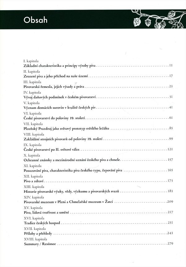 Kniha zachycuje české pivovarství od předslovanského osídlení našeho státu až do roku 2011, souvislost období prosperity a stagnace tohoto oboru s hospodářskou situací, modernizaci výroby, vývoj druhů piv, vývoj odborného školství, vliv pivovarství na české umění a jeho projekci v daňových soustavách i souhrn názorů na zdravotní aspekty konzumace piva.