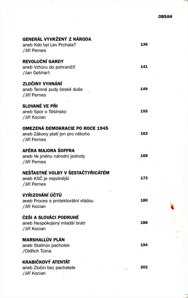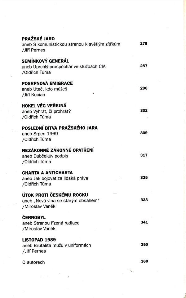 Poněkud neobvyklý výběr historických událostí, které představují spíše odvrácenou tvář českých dějin. Jedná se o události neslavné, skandály, aféry a události, které vzbuzují pochybnosti, dohady, nedůvěru apod. Tedy ty úseky národních dějin, na které nemůžeme být příliš hrdi, které ovšem tvoří součást naší historie. Podle podobného klíče vybírali autoři i osobnosti. Jednotlivé příspěvky jsou dílem renomovaných historiků.