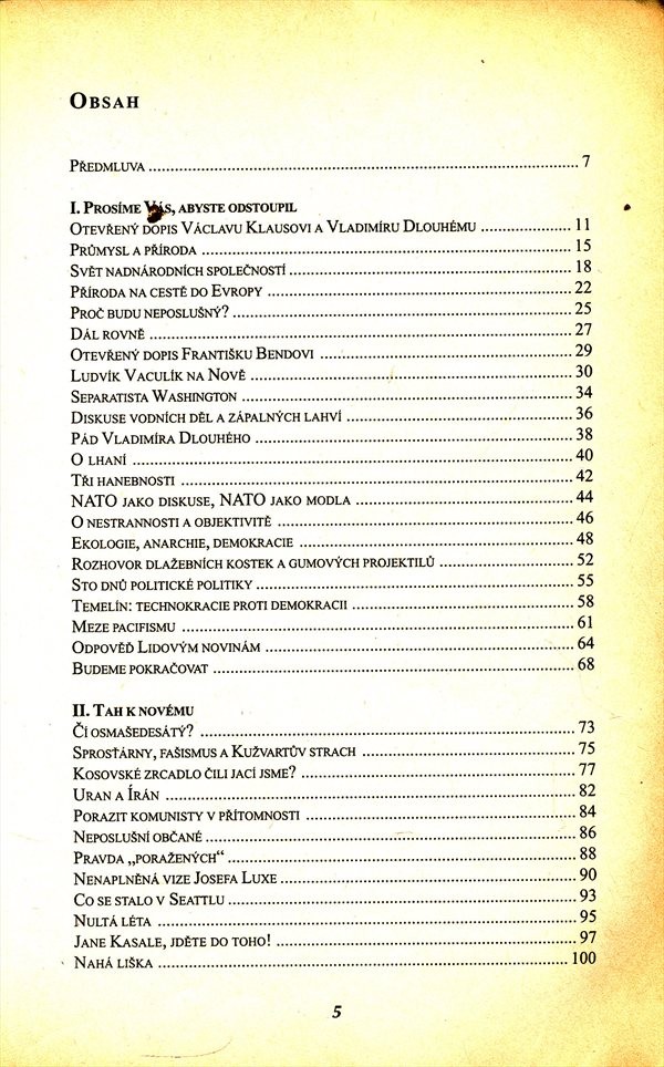 Tématicky velice různorodé texty (např. kapitalismus, NATO, Temelín, televizní krize, české národní zájmy) glosují situaci na české politické scéně i vývoj v oblasti životního prostředí během uplynulého desetiletí. Z příspěvků je jasný příklon spoluzakladatele hnutí DUHA od ekologické problematiky k interpretaci stavu naší politické scény.