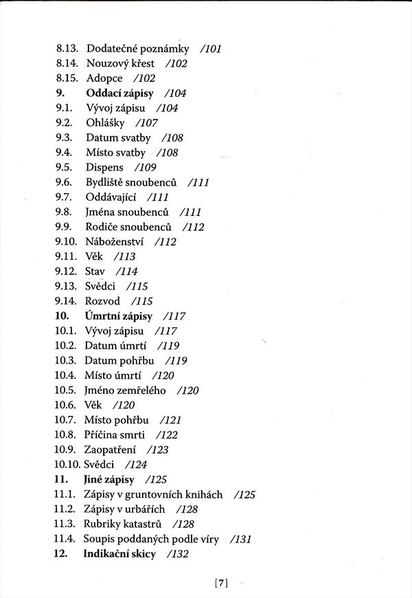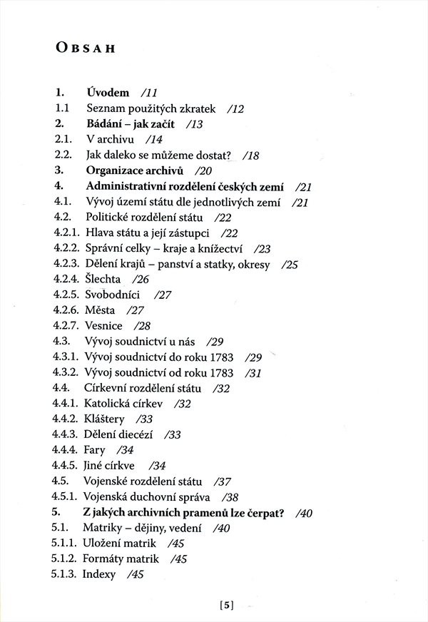 Autor rozebírá krok za krokem cestu zpátky po linii rodu. V úvodních kapitolách přináší cenné poučení o organizaci a účelu archivů, zabývá se administrativním rozdělením českých zemí od 16. století, problematikou matrik a matričních zápisů i dalších důležitých listin (křestní, oddací a úmrtní zápisy). Na závěr radí čtenáři, jak zpracovat výsledky bádání, případně založit rodinnou kroniku. Důležitou a obsáhlou částí příručky jsou přílohy - slovníček zkratek latinských, německých a staročeských slov i další potřebné slovníčky. Závěr publikace tvoří bibliografie, internetové adresy a obrazová příloha historických listin a zápisů.
