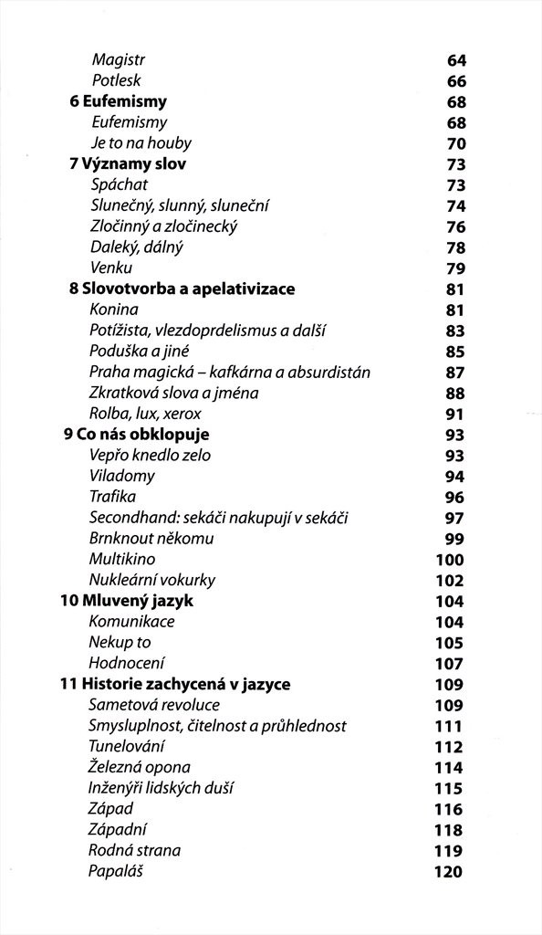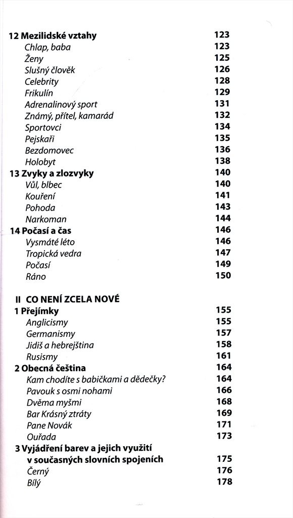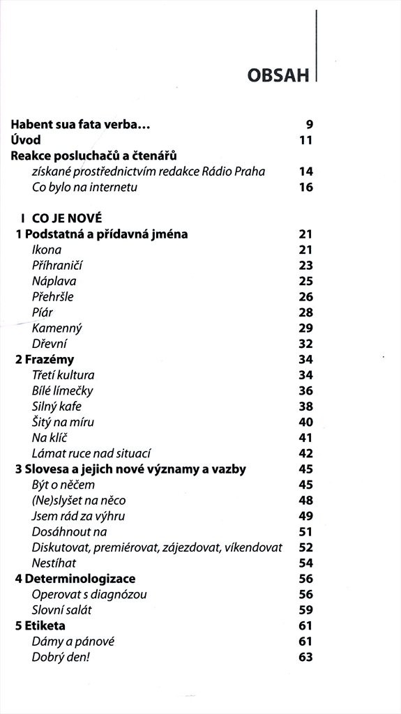 Fejetony jsou uspořádány do tematických okruhů, zachycujících nové prvky v češtině - nová slova, nový význam slov, nové slovesné vazby, současné eufemismy, jazykové přejímky, zvyky a zlozvyky. Všechny popisované jevy autorka dokládá výstupy z databází Českého národního korpusu.