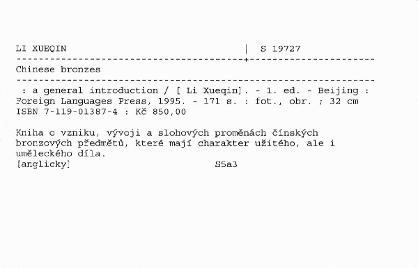 Kniha o vzniku, vývoji a slohových proměnách čínských bronzových předmětů, které mají charakter užitého, ale i uměleckého díla.