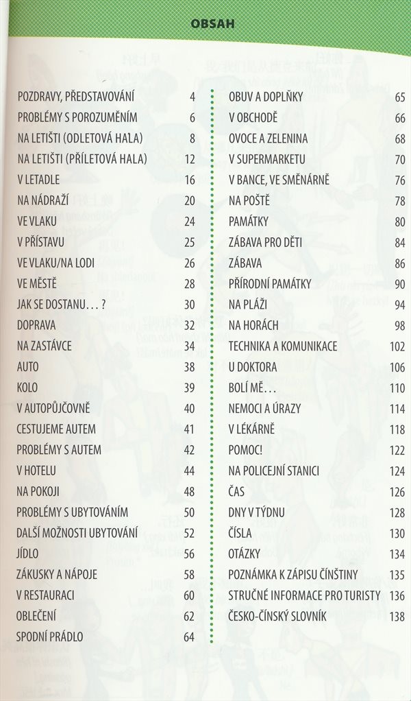Slovíčka i fráze, které lze využít na letišti, na nádraží, v hotelu, v obchodech či v lékárně. Vedle ilustrací jsou uvedena slovíčka i s výslovností a často používané výrazy. S pomocí této příručky se budeme v cizině moci zeptat na cestu, koupit si jízdenku či vyměnit peníze v bance.
