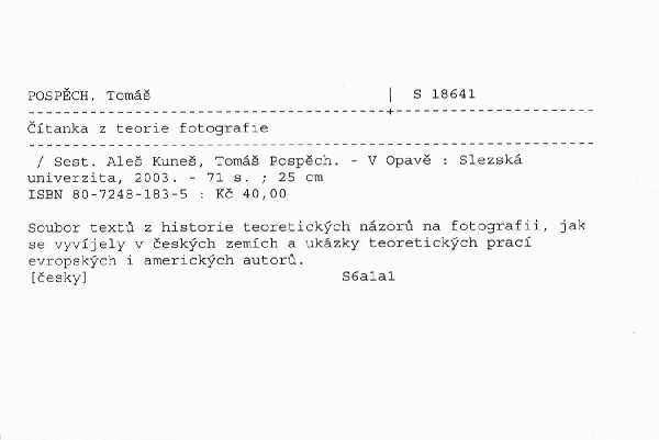 Soubor textů z historie teoretických názorů na fotografii, jak se vyvíjely v českých zemích a ukázky teoretických prací evropských i amerických autorů.